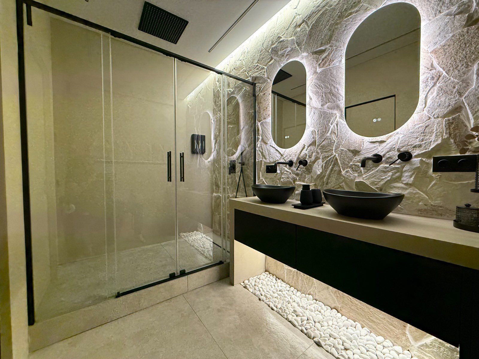 • Minimalist interior featuring hidden doors, natural stone, and ambient lighting